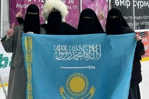 Ce sujet a refait surface au printemps dernier après la publication sur les réseaux sociaux d’une photo prise à la patinoire couverte d’Atyrau. On y voit quatre jeunes filles en niqab posant avec un drapeau kazakh « modifié ». Outre le soleil traditionnel, l’aigle en vol et les ornements, on y voyait un sabre et une inscription en arabe : la shahada.