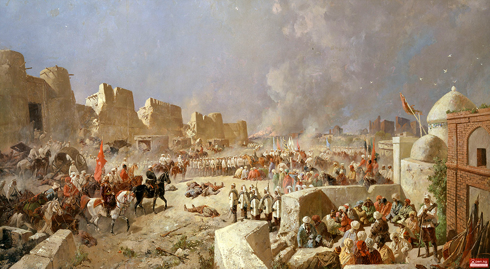 En mai 1868, la ville a été conquise par l’armée russe sous le commandement du général Constantin von Kaufmann. La même année, lorsque les troupes russes sont parties à la poursuite de l’émir de Boukhara, un tout petit garnison russe a été laissé dans la forteresse de Samarcande. Elle comptait au plus sept cents hommes, armés uniquement de fusils, de mortiers et de deux canons russes. La ville disposait encore de 24 canons boukhariens, mais ceux-ci avaient été rivetés et étaient inutilisables.