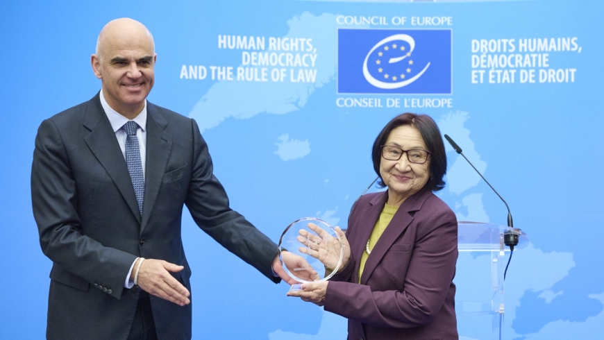 Le Secrétaire Général du Conseil de l’Europe, Alain Berset, remet le prix à Aziza Abdirasoulova. Photo du site coe.int