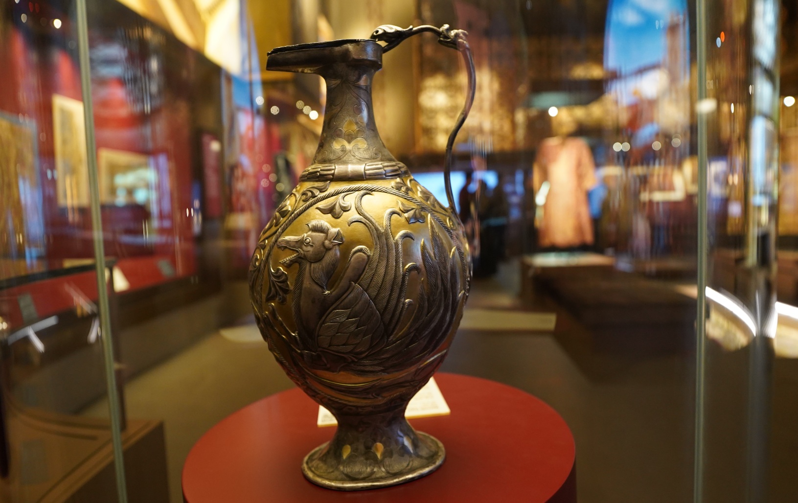 La carafe a trouvé sa place dans l’exposition de la salle consacrée à la période préislamique. Ce récipient fait partie des monuments les plus précieux de l’art du travail des métaux du début du Moyen Âge. Au Ve-VIIIe siècle, la tradition de décorer les objets métalliques avec des images d’animaux et de créatures mythologiques symbolisant la force, la protection et le bien-être était très répandue en Asie centrale.